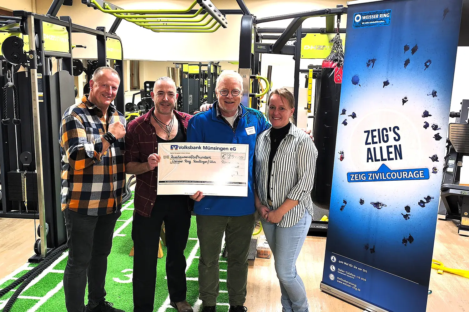 Oliver Boenisch (links), Michael Gräßler und Corinna Lang übergeben Volker Zaiß (2.v.r.), Leiter der Reutlinger Außenstelle der Organisation „Weißer Ring“ einen Spendenscheck über 2.500 Euro.